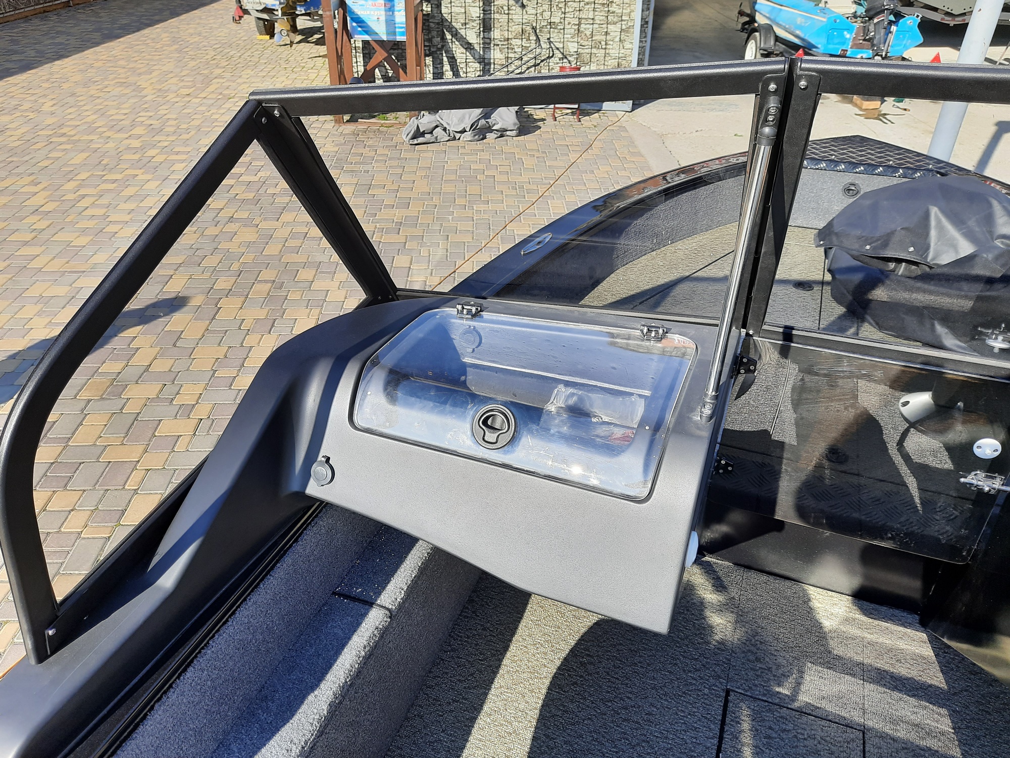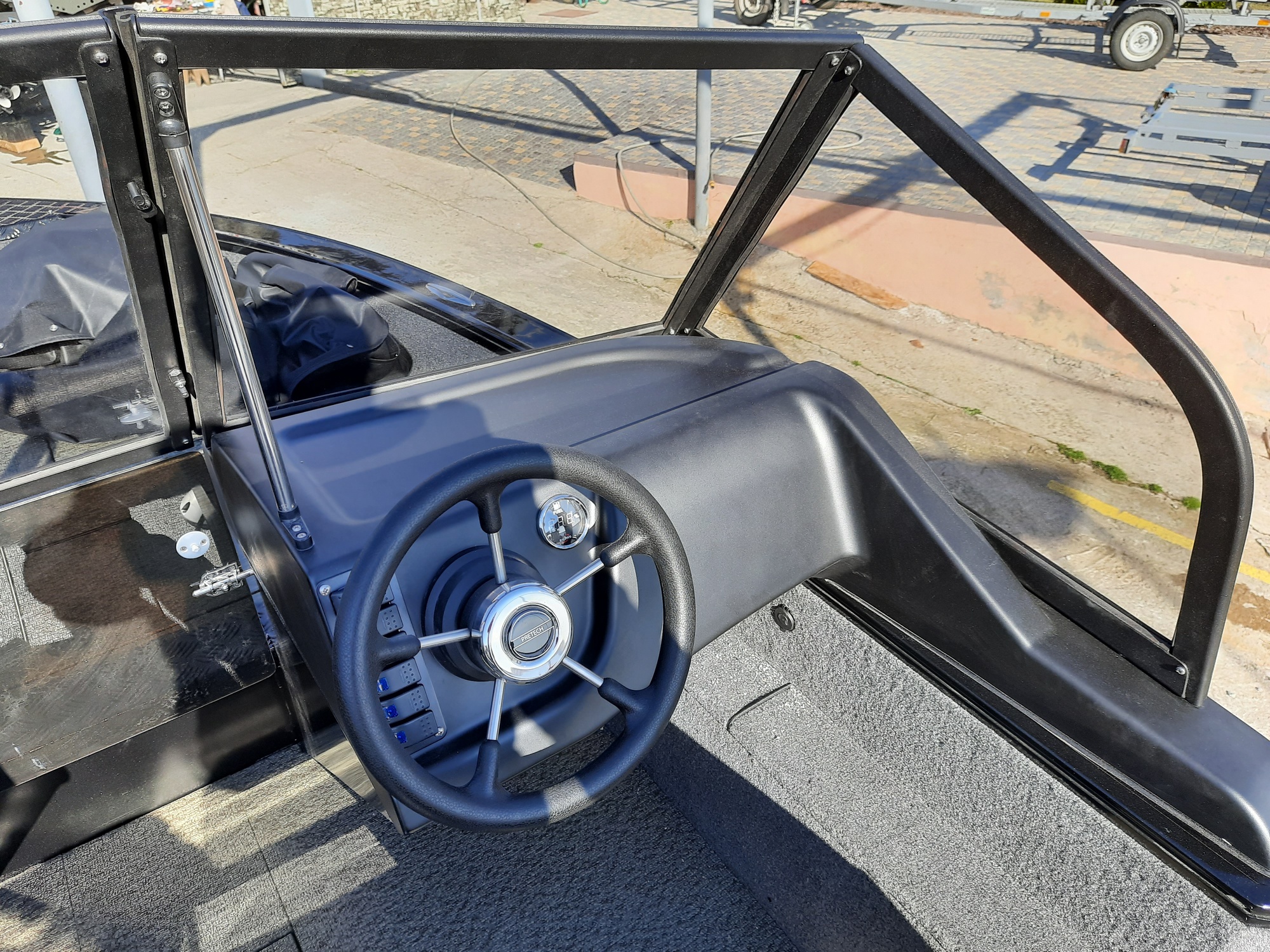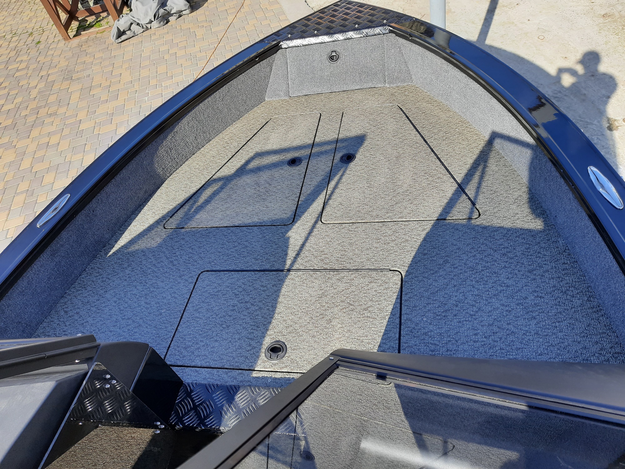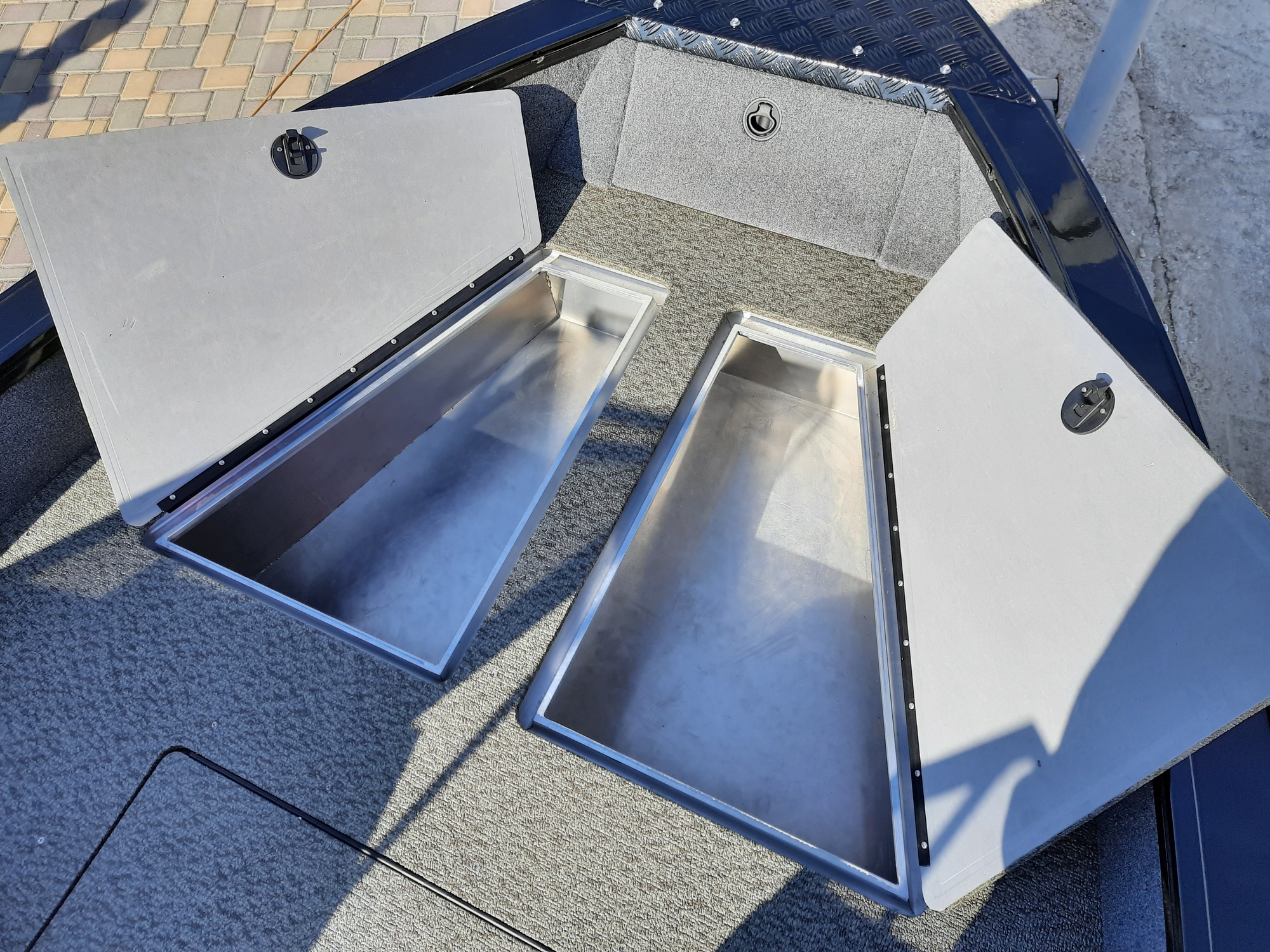 All-welded aluminum fishing boat. Deadrise transom / midship 14 ° / 24 ° Length, m 4,7 Width, m 1,97 Transom height, m 0,51 Max power, hp 115 Body / bottom thickness, mm 3 / 3 Lifting capacity, kg 500 Passenger capacity 4 Weight, kg 470